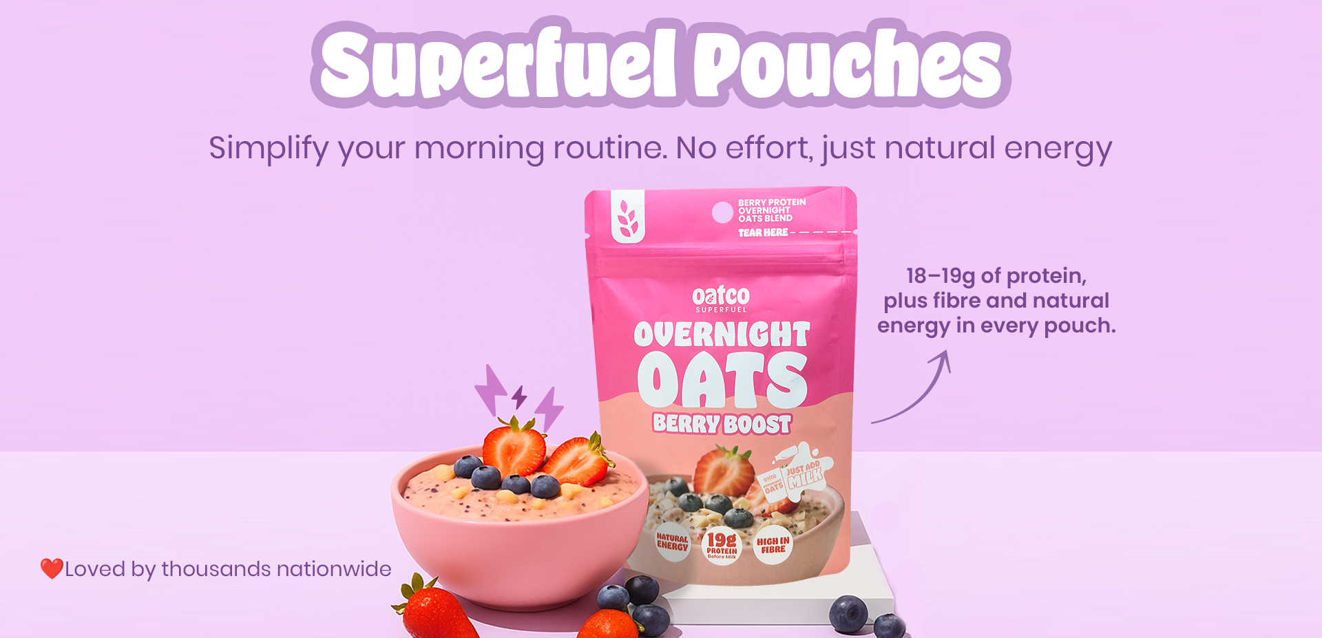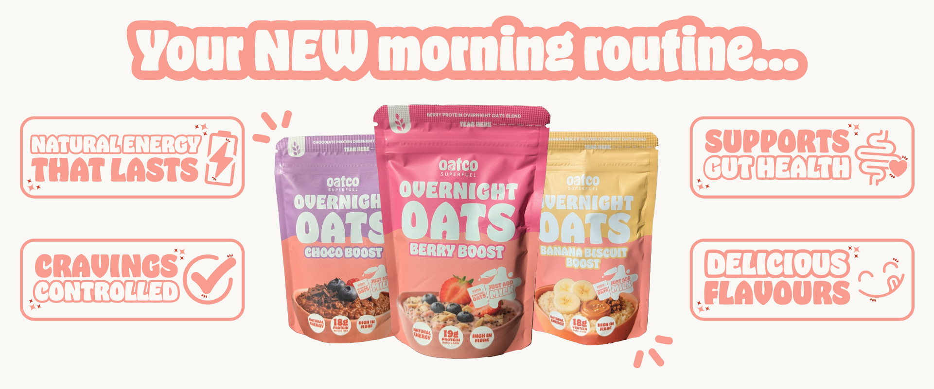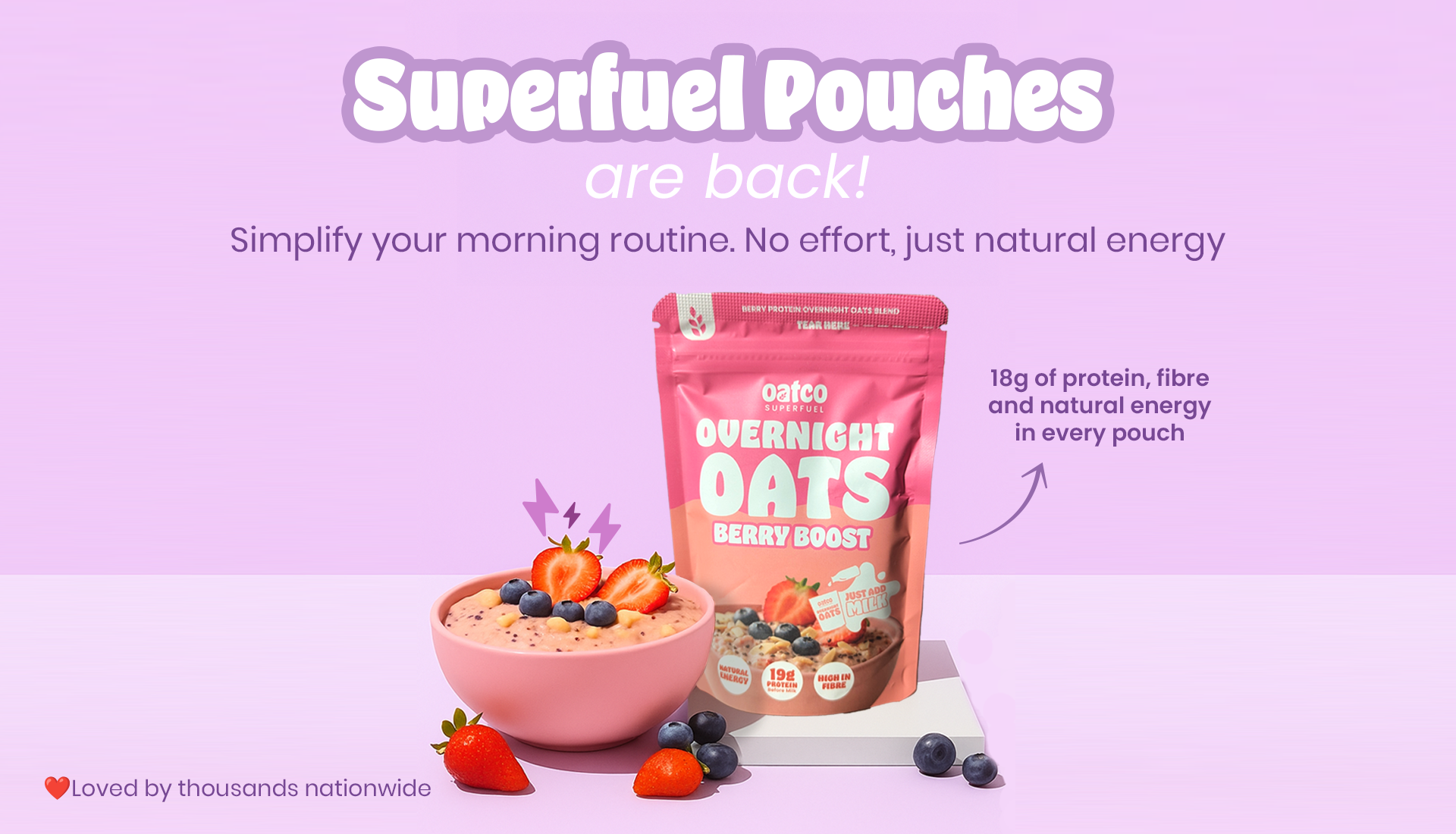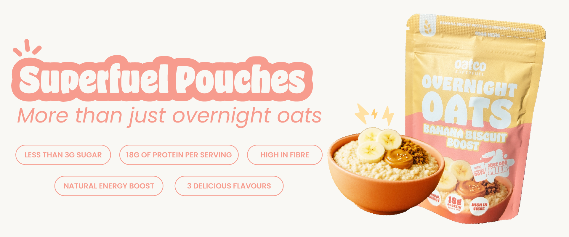 Our superfuel pouches are protein packed overnight oats made to fuel your day. With nothing to prep Oatco helps fuel busy lives with flavour, fibre and natural energy.