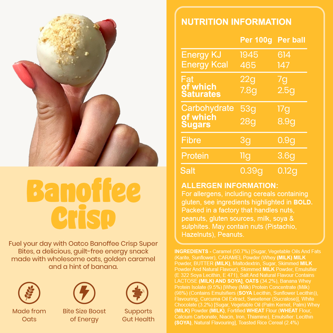 Oatco Superfuel Banoffee Crisp Super Bites, are the perfect blend of golden caramel, a hint of banana, oats and crispy goodness in a naturally energising snack.