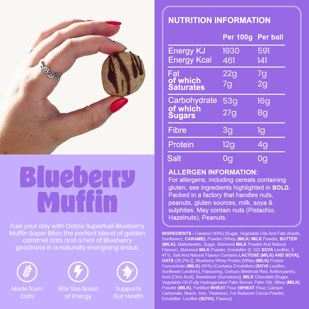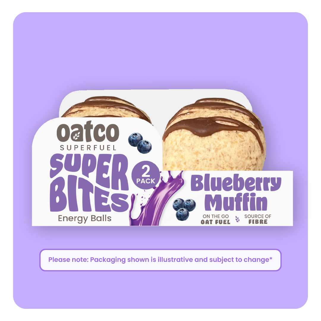 Oatco Superfuel Blueberry Muffin Super Bites, the perfect blend of golden caramel, oats and a hint of Blueberry goodness in a naturally energising snack.