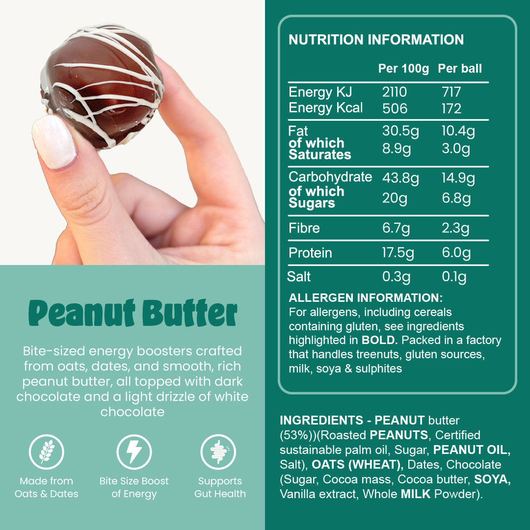 Ingredient List: PEANUT butter (53%) (Roasted PEANUTS, Certified sustainable palm oil, Sugar, PEANUT Oil, Salt), OATS, Dates, Chocolate (Sugar, Vegetable Oil (Fully Hydrogenated Palm Kernal, Palm Oil), Fat Reduced Cocoa Powder, Fortified WHEAT Flour (WHEAT